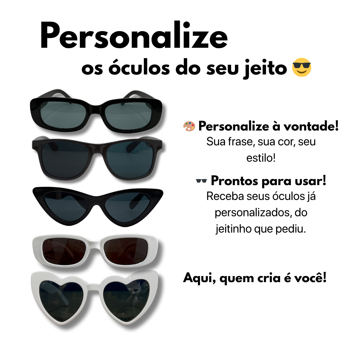→ Exemplo: Se comprar 15 óculos, pode personalizar 15 frases diferentes, misturando entre os modelos e cores disponíveis.